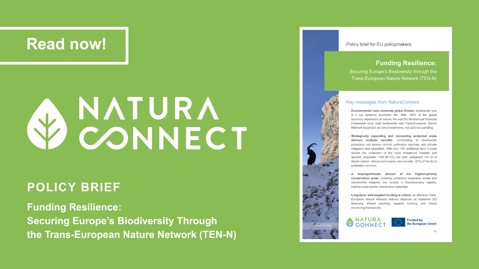 NaturaConnect aims to support countries in designing and developing a blueprint for a truly coherent Trans-European Nature Network (TEN-N) of conserved areas that protect at least 30% of land in the European Union, with at least one third of it under strict protection. Our project unites universities and research institutes, government bodies and non-governmental organisations, working together with key stakeholders to create targeted data, knowledge and tools, and build the capacity needed to support European Union Member States in realising an ecologically representative, resilient and well-connected network of conserved areas across Europe.