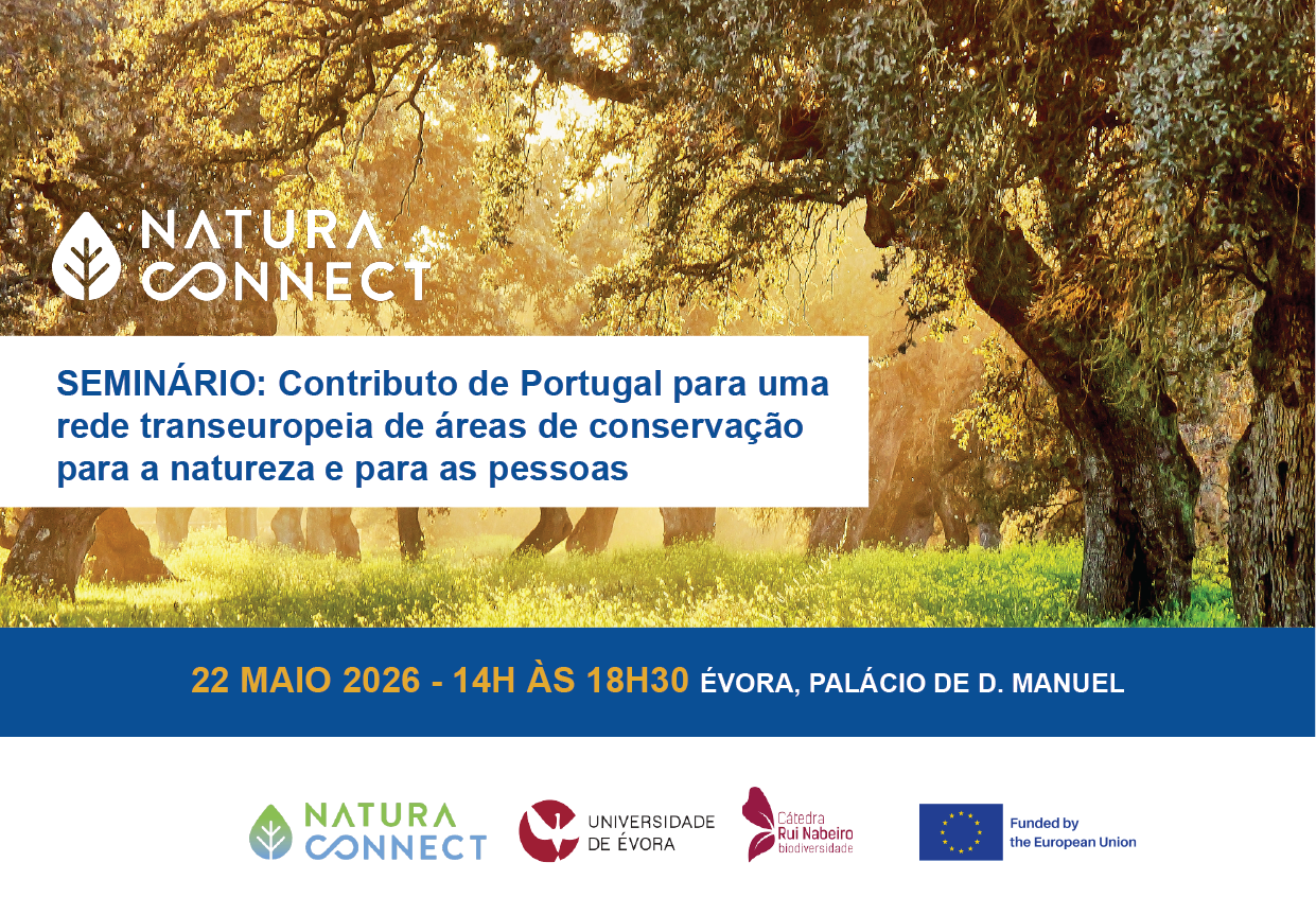 The programme begins at 2.00 pm, with the Mayor of Évora, Carlos Zorrinho, attending the opening session. The first part of the programme is dedicated to the results of the NaturaConnect project in Portugal, with a focus on ecological connectivity, the expansion of protected areas and the 10% strict protection target, as well as biodiversity funding. Presentations will be given by Miguel Bastos Araújo, from the University of Évora; Henrique Miguel Pereira, from the German Centre for Integrative Biodiversity Research (iDiv)/Biopolis/INBIO ; Daniel Veríssimo, from Rewilding Europe; and Bárbara Pais, from the NaturaConnect project team in Portugal.